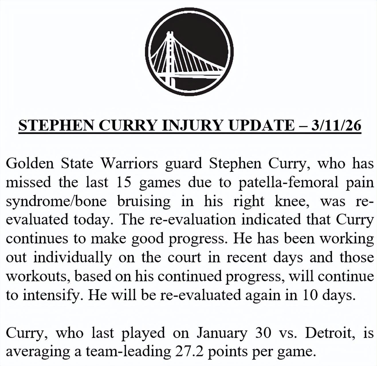 北京时间3月12日,勇士官方宣布,库里因右膝髌股疼痛综合征/骨挫伤已连续缺席15场比赛,今日他接受了复查。复查结果显示,库里的康复进展良好。近期他已在场上进行个人训练,且基于目前的恢复情况,训练强度将逐步提升。他将在10天后再次接受复查。库里上一次出战是1月31日对阵活塞的比赛,本赛季他以场均27.2分领跑全队得分榜。